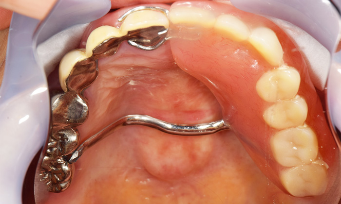 入れ歯を作る場合には骨の隆起が邪魔になることがありますので、場合によっては骨を削る処置が必要になることがあります。こちらの写真では骨の隆起にあわせて金属を曲げて入れ歯を作成しています。