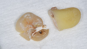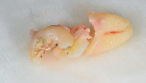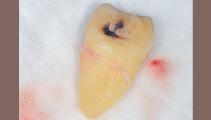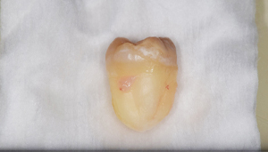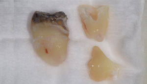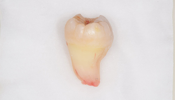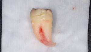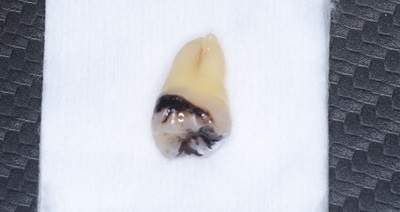 | 担当者所見 | お痛みはなかったものの、大きく虫歯になっており、いつ痛みだしてもおかしくない状態でした。根っこが少し湾曲してましたが、折れることなく、抜歯できました。 |