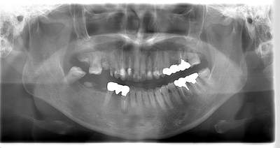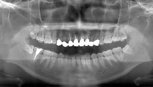 | 抜歯内容 | レントゲン上で右下の親知らずが大きく虫歯になっており、斜めに生えていることもあり患者様の希望により抜歯することとなりました。 当日は痛みがあったため抗生剤と鎮痛剤にて炎症を抑え、後日歯ぐきを切開し、抜歯を行いました。 レントゲン上でも分かるように親知らずの根が二つに分かれており根が折れてしまう可能性がありましたが、このケースでは事前にCTを撮影し、歯の位置、根の方向を確認していたため根が折れることなく抜歯ができました。 術後数日は腫れと痛みがありましたが、薬の服用で抑えることができ、1週間後の糸取りの際には痛み、腫れともになくなっていました。 |