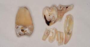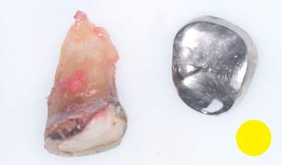 | 担当者所見 | 左上親知らずは、メタルの被せ物が抜歯の際に外れ、中は虫歯で歯が溶けていました。 右上、左下もレジンのような材料で治療した痕がありましたが、いずれも大きく欠けており、歯として機能していませんでした。 |