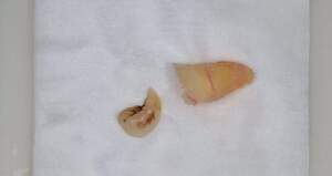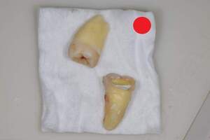 | 抜歯内容 | 当院に通院中の患者様です。右下の親知らずが埋まっていて、一部だけ見えてきており、そこが穴になってしまい食べ物が詰まってしまう状態でした。そのため、親知らずに被っている歯肉を切開し、その後、歯の一部が骨で囲まれているため周りの骨を落としました。そして器材を引っかけるところが出来たところで抜歯しました。 この症例では事前にCTを撮影し、歯の根が2本に分かれており、根が曲がっていることが分かっていたため、歯を抜く際に力をかける方向に気をつけて丁寧に抜歯を行い、根が折れることなく抜歯を終えることができました。 |