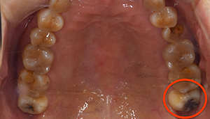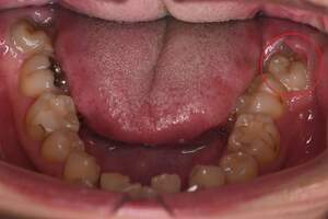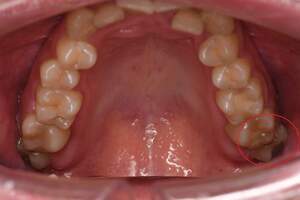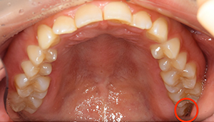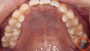 | 担当者所見 | 元々カリエスリスクが高く、歯ブラシが親知らずまで届いていないことから虫歯になったと考えられました。 手前の7番目の歯も大きな虫歯になっており、こちらは神経を取る治療を行なっていきます。 |