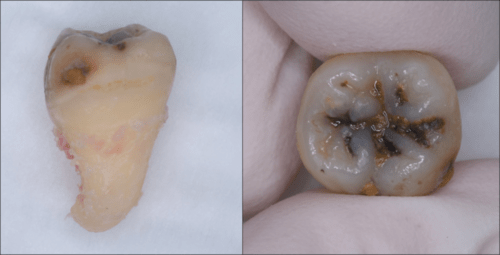 | 担当者所見 | 右上8番は咬合面から大きく虫歯になっていましたが、すんなり抜歯することができました。 |