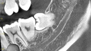 CTで親知らずと神経(下歯槽管)の位置を確認しました。