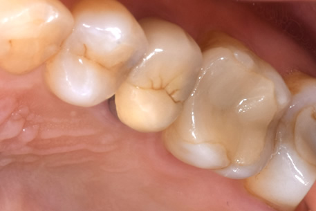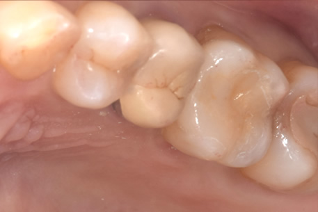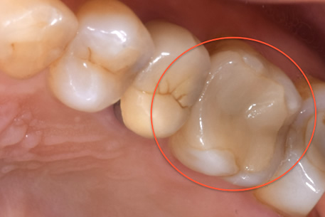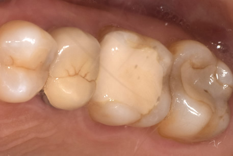 この場合、茶色い部分を探針で探ってみると硬い場合がほとんどで虫歯の柔らかさを感じることがありません。