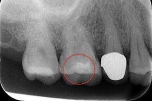 写真のレントゲンを見て頂くとわかると思います。赤丸の歯は、黒い影が歯の真ん中の黒い部分に達していますね。これが虫歯が歯の神経に達しているレントゲン写真になります。このような場合は、虫歯を取り除き歯の神経の治療が必要になり、その後に土台やかぶせ物の治療をします。