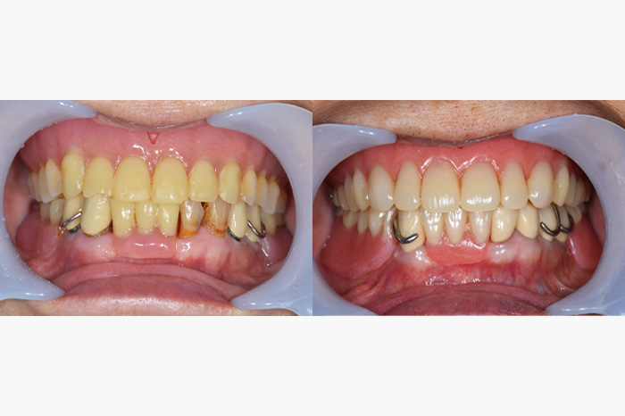 | 治療内容 | 入れ歯を作り直すときに、被せ物もやり直しになりました。 虫歯が進行し、抜かなければならない歯が1本ありましたが、その他の歯に関してはしっかり残せました。 抜歯後、治療用の入れ歯を作成し、歯ぐきの治癒を待っている間に既製のメタルボンドクラウンを除去し、仮歯におきかえ、入れ歯の完成と一緒にメタルボンドクラウンを作成しました。 |