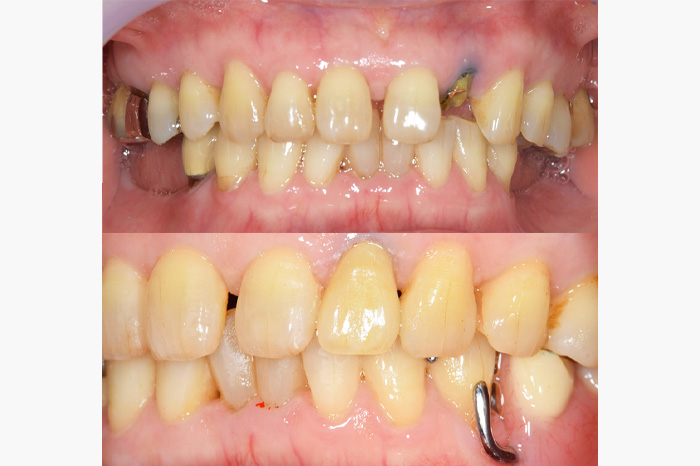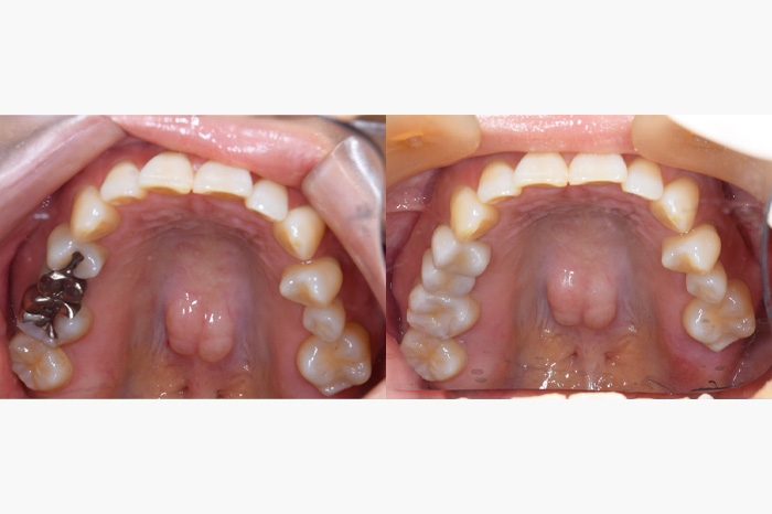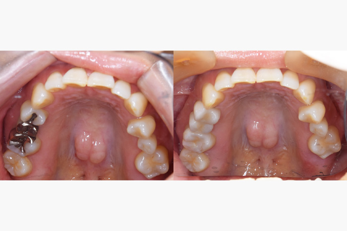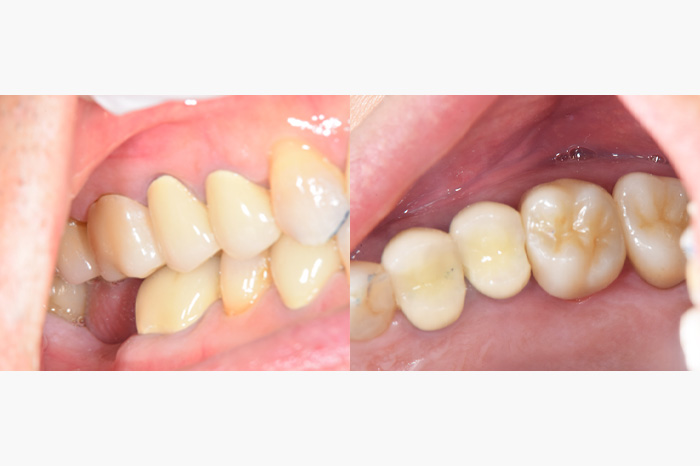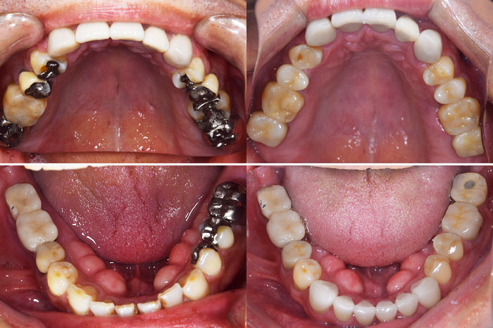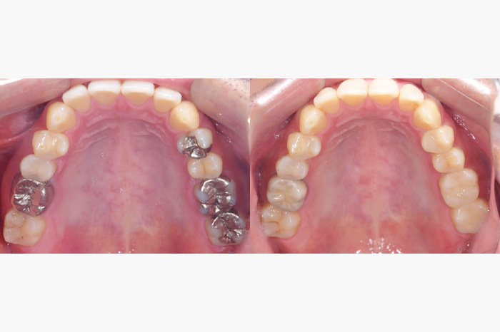 銀歯を全部外してセラミックの詰め物、被せ物にしたケースになります。銀歯の中では虫歯になっている事が多く、よく私もそういうケースを目にします。こちらのケースでは、虫歯が大きくなっており、残せない歯があったため、インプラントを使用している部分もあります。