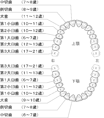 乳歯は個人差もありますが、生後6か月ころに下顎の前歯(乳中切歯)がはえ始め、3歳頃までに上顎10本、下顎10本の計20本がはえ揃います。