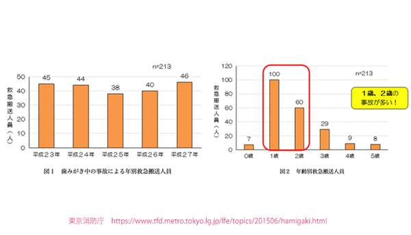 お子さんの歯ブラシ時の事故が多く起きているので、お子さんが歯ブラシをしている際は目を離さないようにしましょう。