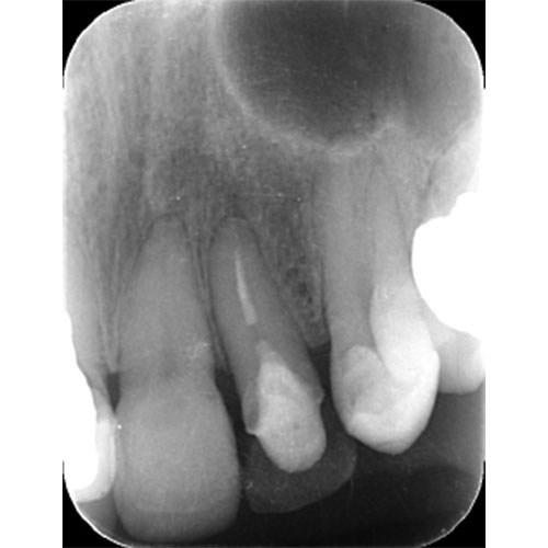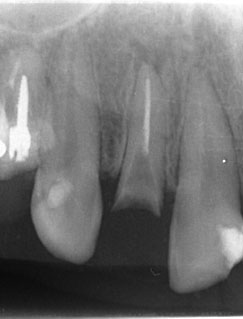 | 治療方針 | 左上2番目の前歯が変色。原因は失活歯であったことと、CRの周囲でカリエスになっていたため、 また、そのカリエスも大きく、このままでは保存が不可能であったため、歯を挺出させて保存することとした。 |
