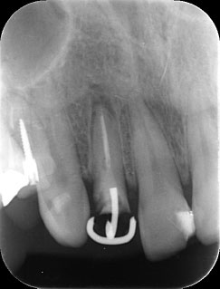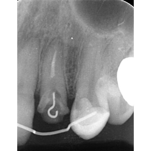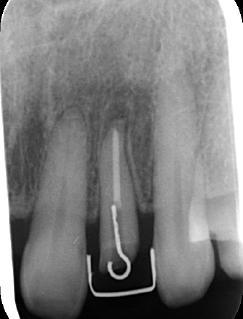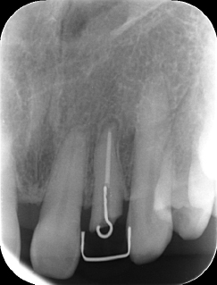 | 治療前で歯根が長いのがわかります。歯根がある程度長く無いと、MTMは行えません。 | MTM終了時のもの。フックが上の金属に接している。また根尖に透過像があるが、歯が動いた証拠です。 |