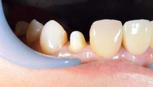 右の写真では歯肉の上に歯が一周のこり、その上にコアが入っているのがわかります。