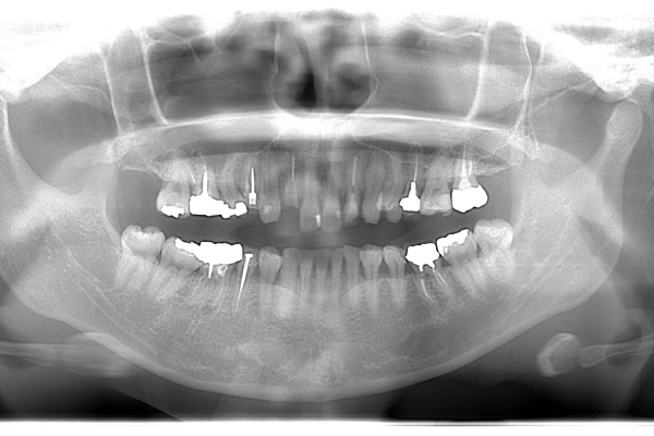 | 治療方針 | 長年使ってきた義歯の人工歯が磨耗し、臼歯部での咬合がすくなくなり、前歯部での接触が強くなったことで生じた前歯の破折なので、義歯も作り変える必要があります。 |