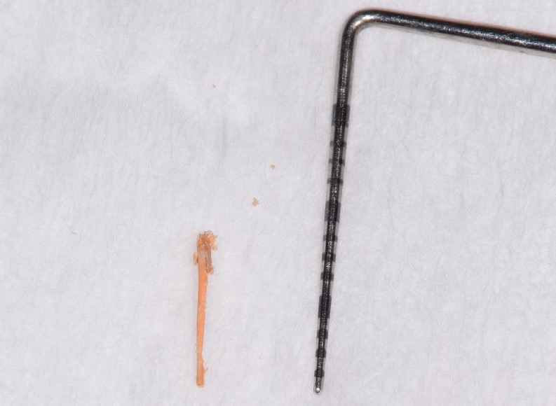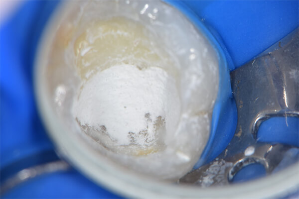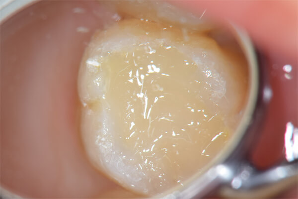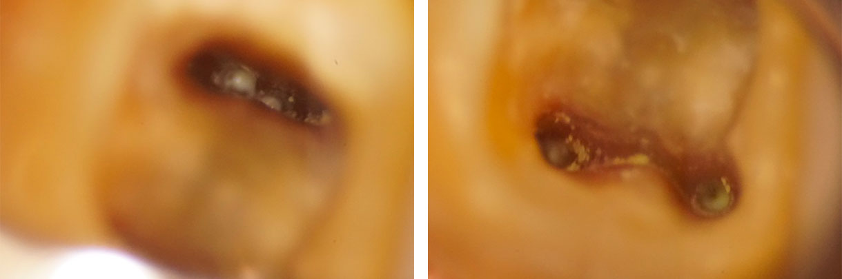 肉眼では根の先端は見ることができませんがマイクロスコープでは見ることができます。根の先端をこれ以上破壊しないように清掃して歯の神経があった場所にお薬を詰めることができました。根の治療後、かぶせ物までして半年たっても痛みがありません。