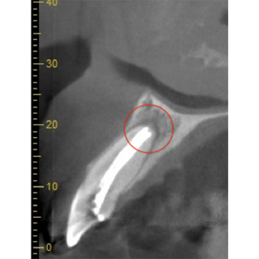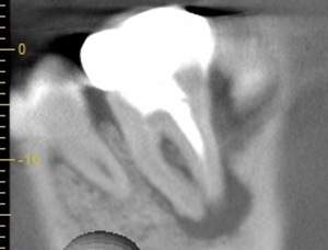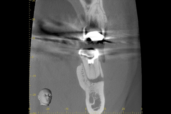| 根の中にお薬を充填した後のCT画像。やはり根の先に黒い影があるのがわかります。 |