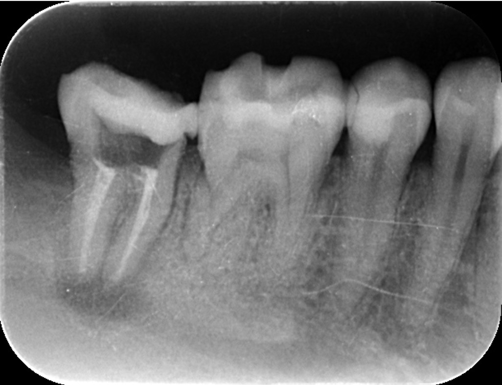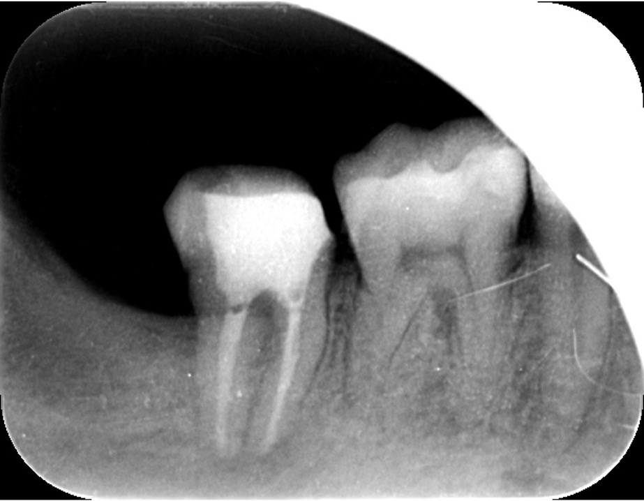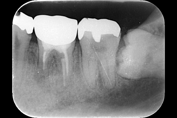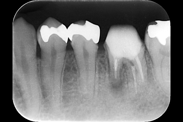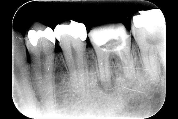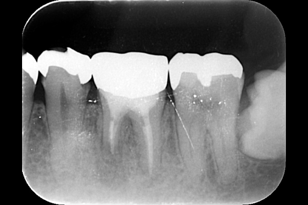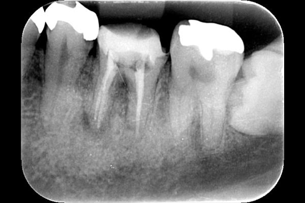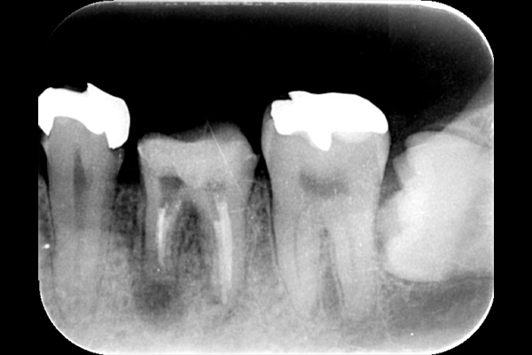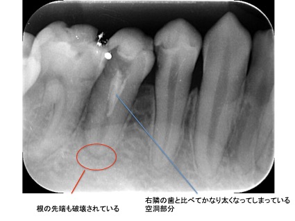 こちらは虫歯で神経を取らないといけなくなりましたが、何度治療しても痛みが消えないと言うことで当院にいらっしゃいました。度重なる治療で歯の神経のあった場所がかなりひろげられており、また根の先端も破壊されている状態でした。ですので、痛みが消えないのです。