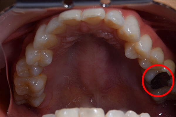 「左上の奥歯に違和感がある」という悩みを持たれている患者様が来院されました。虫歯部分を除去すると歯の神経に届いていましたので、歯の神経を守るために根管治療を行いました。