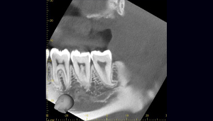 | 抜歯内容 | 右下親知らずが半分埋まっているため、汚れが溜まりやすく気になる為患者様のご希望により抜歯しました。 このケースでは事前にCTを撮影し、歯の位置、神経との位置関係を確認してから抜歯を行っています。 抜歯後、一週間は腫れと痛みがありましたが鎮痛剤を飲んで対応して頂き、糸取りをする頃には痛みや腫れは無くなり、患者様も安心しておられました。 |