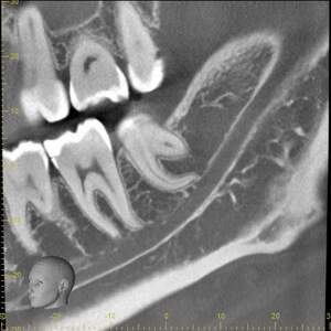 CTで親知らずと神経(下歯槽管)の位置を確認しました。