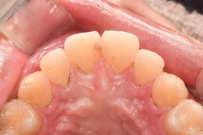 | 治療方針 | 右上1番は元々欠けていて、左上1番近心が虫歯になったタイミングで一緒に治療することになりました。 |