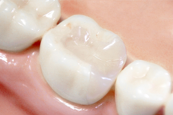 ジルコニアでできた詰め物です。そのため強度はセラミックインレー以上のものになります。見た目もそこまで悪いわけではありませんが、セラミックインレーと比べると、透過性がないため、やや目立ちます。セラミックを入れていたけど、割れてしまったなど、噛み合わせが強い方や、歯軋りのある方におすすめしたい詰め物です。
