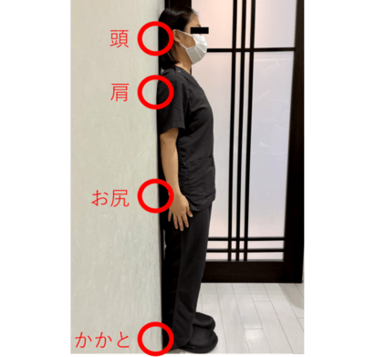 ✓壁に、頭、肩、お尻、かかとがつく状態