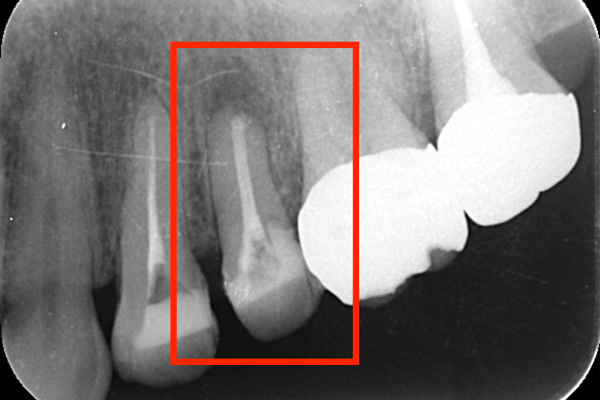 こちらは、歯の根の治療を行い、根の先端までキレイにし、防腐剤をしっかり詰めなおしましたが、膿が溜まったまま治癒しませんでした。破折に気づけなかったのです。