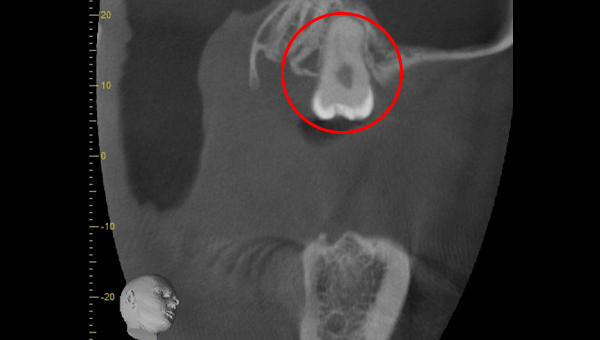 CT像です。根の中央を超えて虫歯が広がっているのがわかります。そこに上の親知らずを移植することに