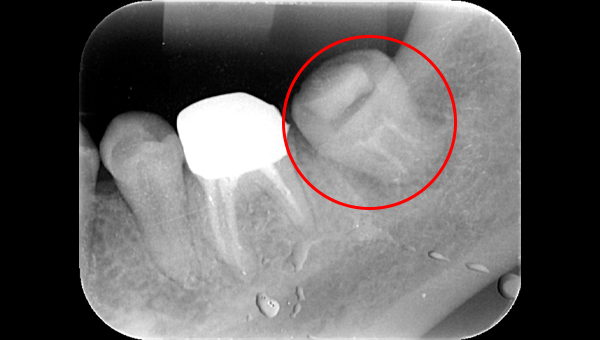 | 治療方針 | 今回のケースは、定期検診にしっかり通っていただいている患者様で、歯の縦破折があり根のまわりに膿がたまっており、いつ痛みがでてもおかしくない状態であることを患者さんに説明していました。 痛みが出た場合は抜歯になること、使ってない親知らずがあるので、それを利用して歯の移植手術ができることを説明していました。 そしてついに痛みが出ましたので、抜歯して歯の移植を行うことになりました。 |
