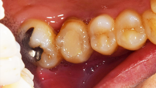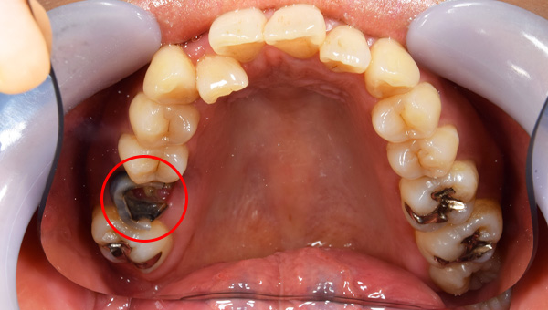 初診時の口腔内です。かぶせ物があり、一見虫歯とはわからないです。