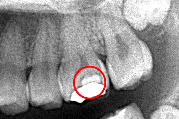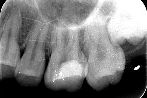 こちらは虫歯で神経を取らないといけなくなりましたが、何度治療しても痛みが消えないと言うことで当院にいらっしゃいました。度重なる治療で歯の神経のあった場所がかなりひろげられており、また根の先端も破壊されている状態でした。ですので、痛みが消えないのです。