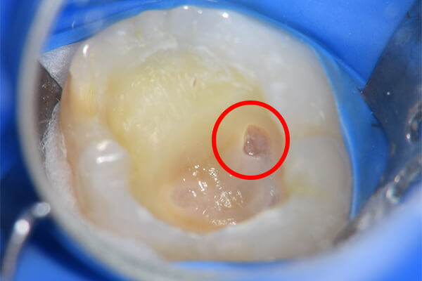 「左上の奥歯に違和感がある」という悩みを持たれている患者様が来院されました。虫歯部分を除去すると歯の神経に届いていましたので、歯の神経を守るために根管治療を行いました。