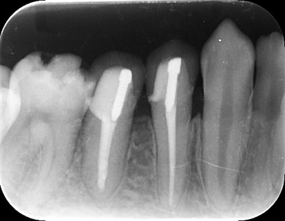 肉眼では根の先端は見ることができませんがマイクロスコープでは見ることができます。根の先端をこれ以上破壊しないように清掃して歯の神経があった場所にお薬を詰めることができました。根の治療後、かぶせ物までして半年たっても痛みがありません。